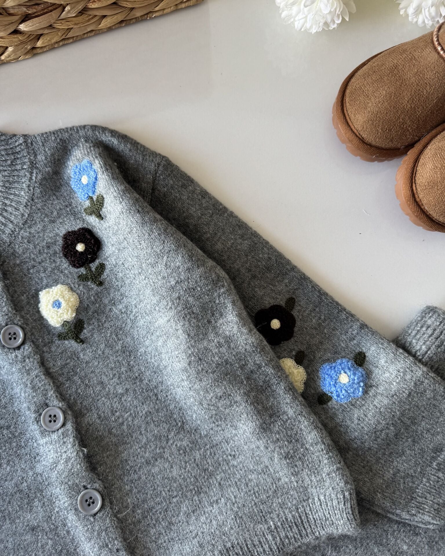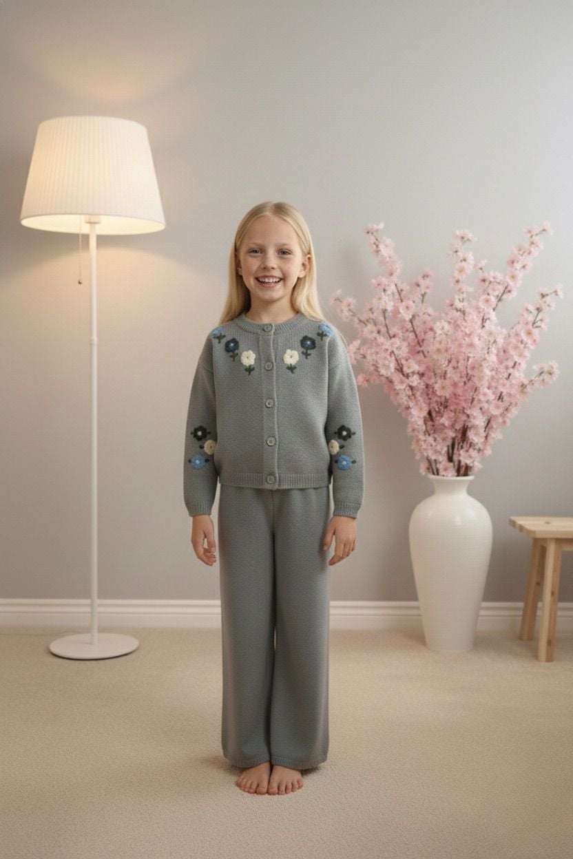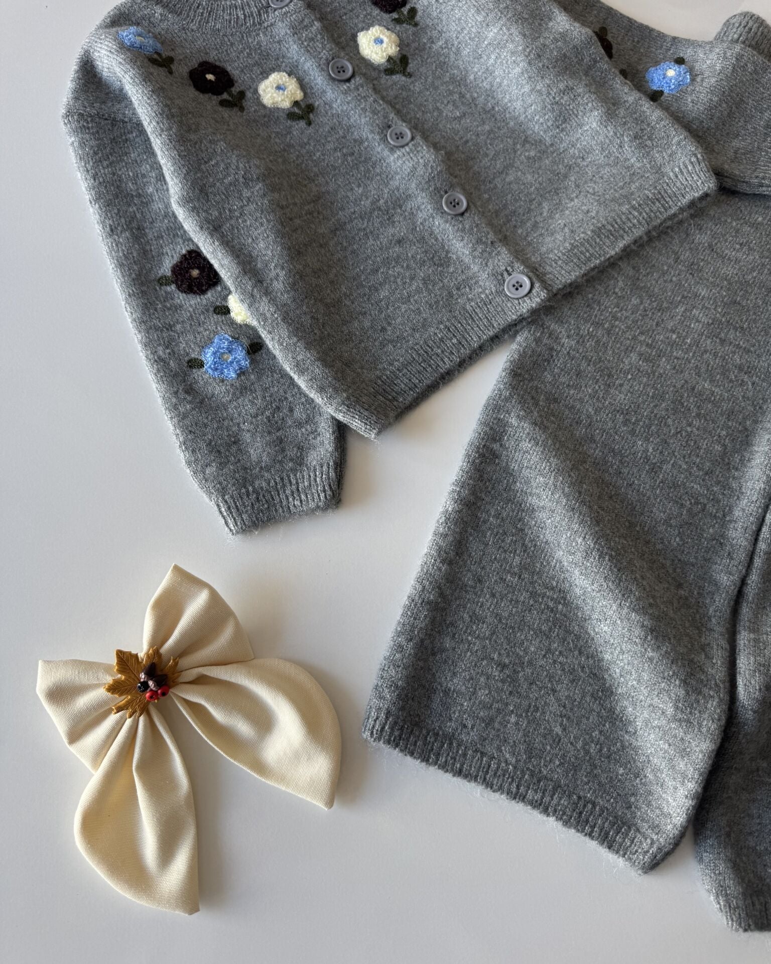 Triko Çiçek Punch Nakışlı Takım - Gri