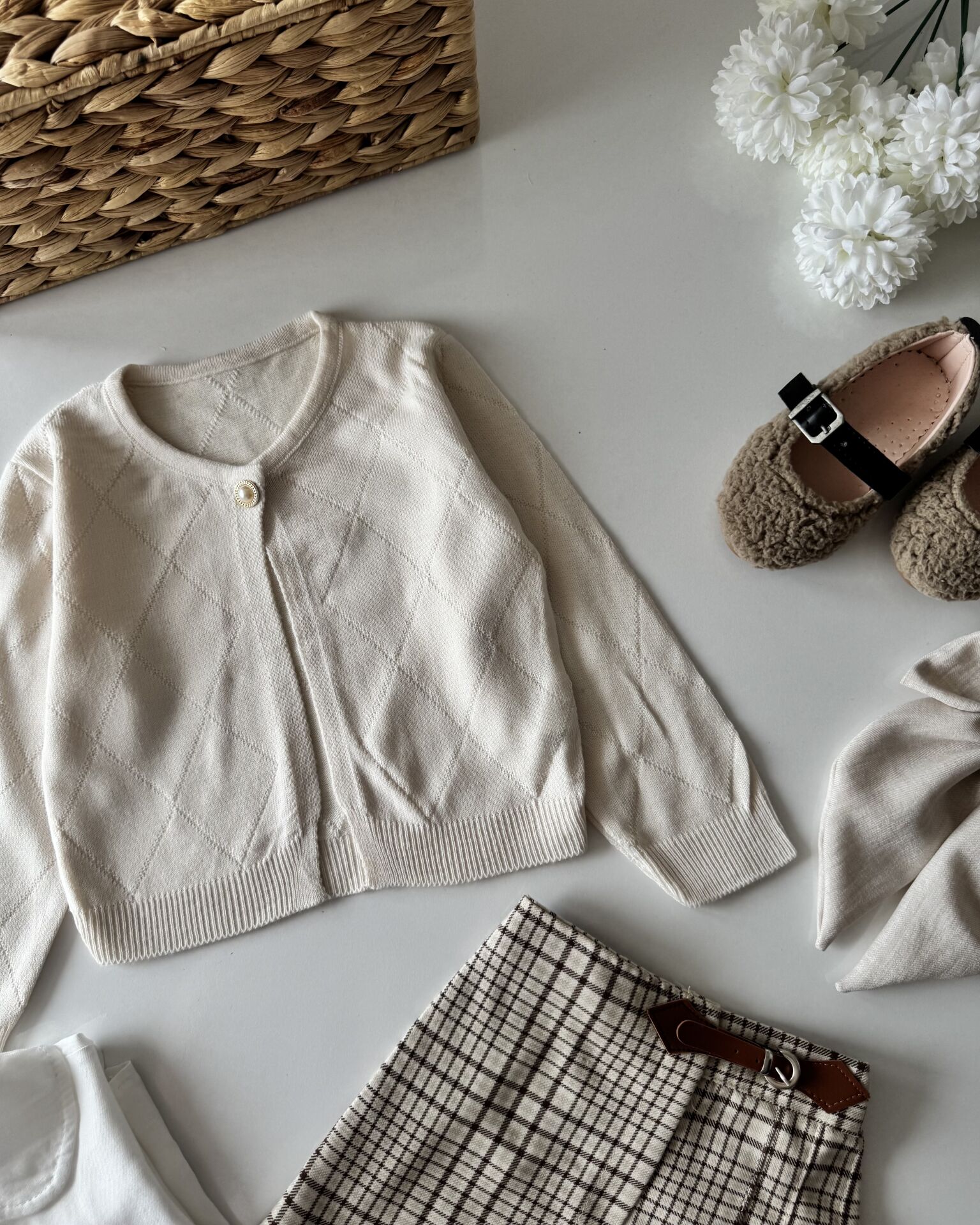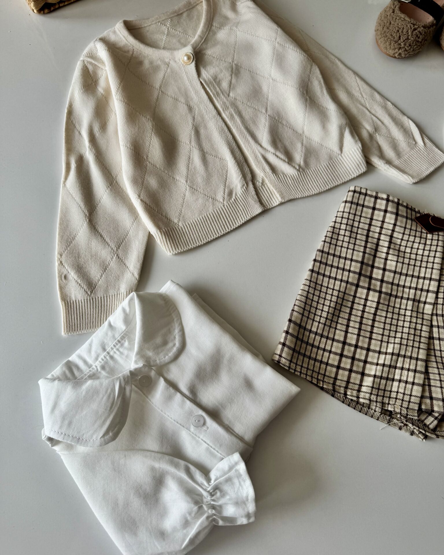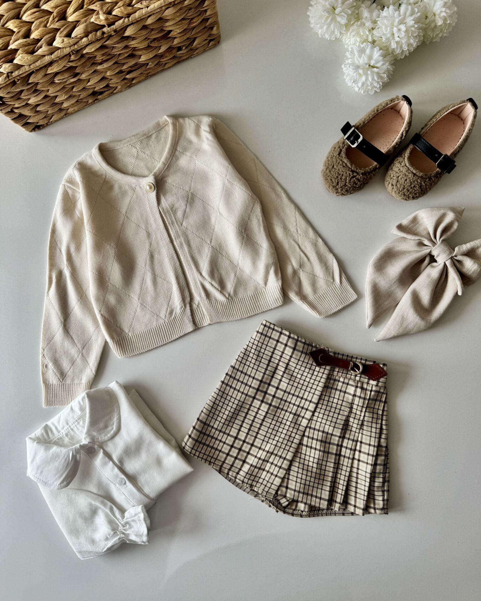 Ürünün Set İçeriği ; Triko hırka, kareli şort etek, pamuklu gömlek