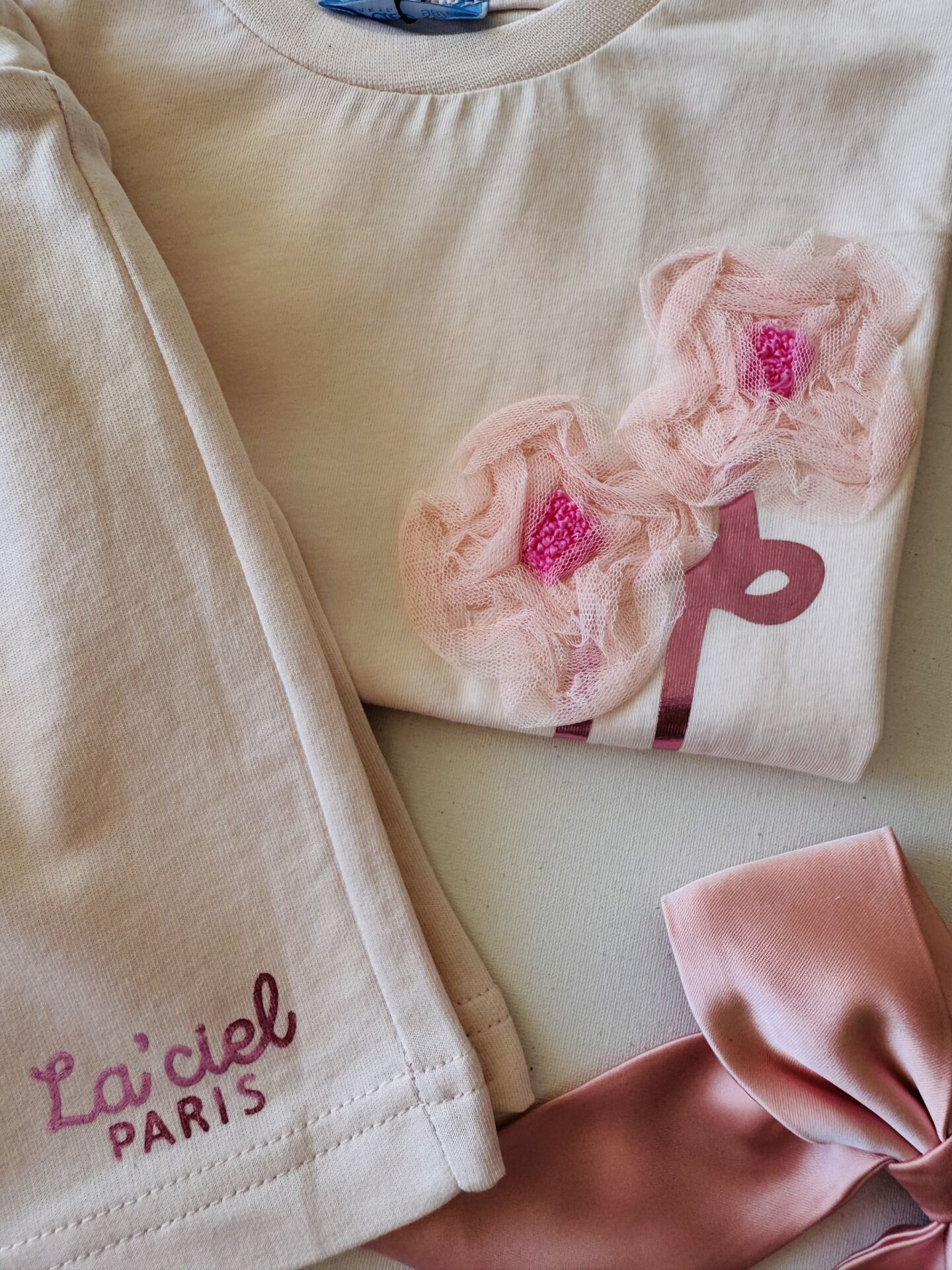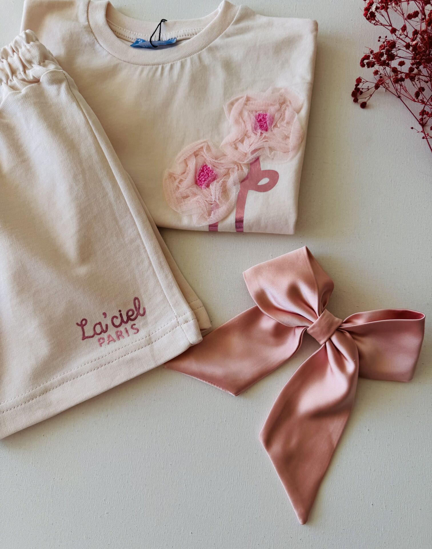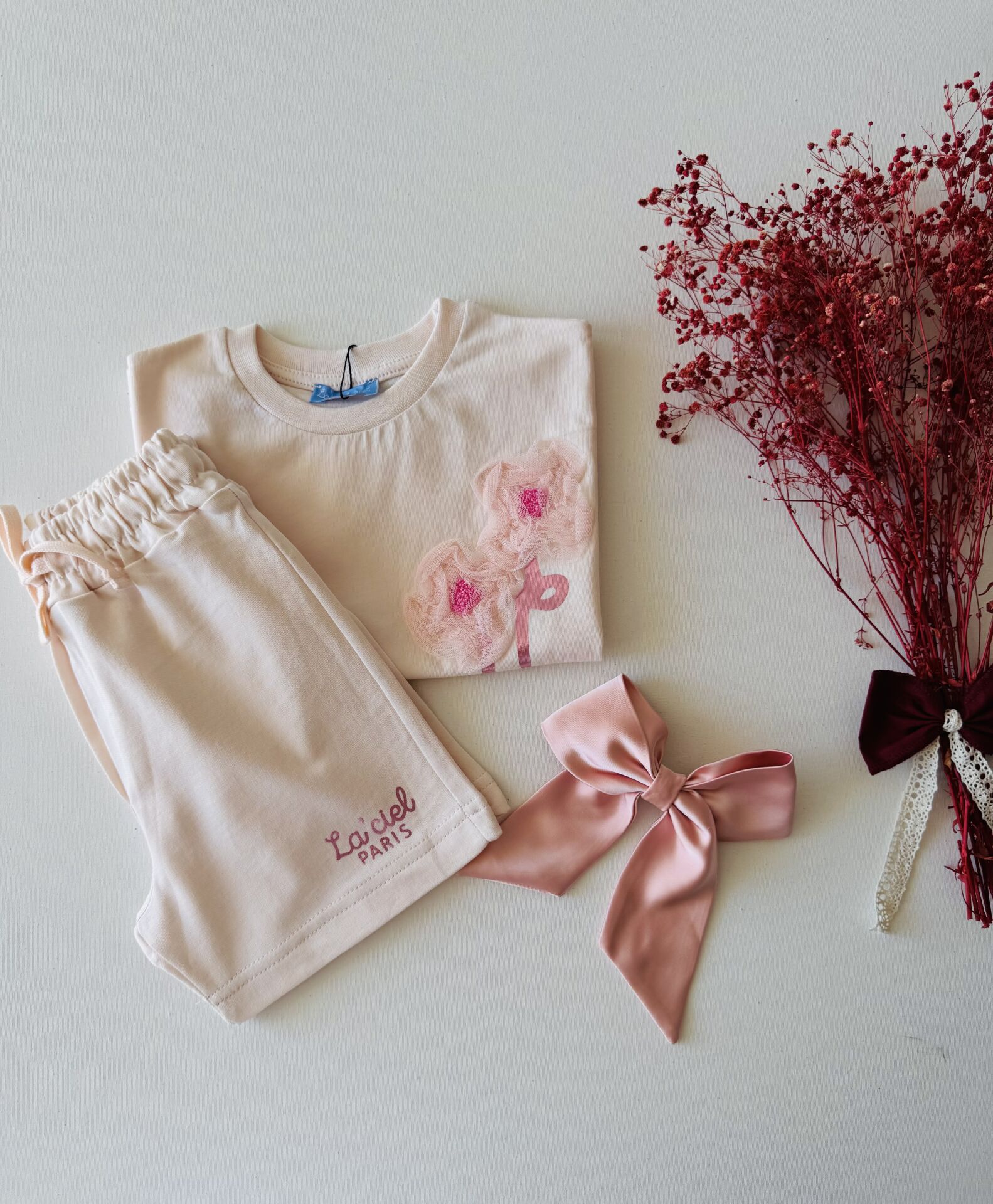Ürün Bilgisi ; Penye kumal üzeri tül gül aplikeli sloganlı 2'li takım