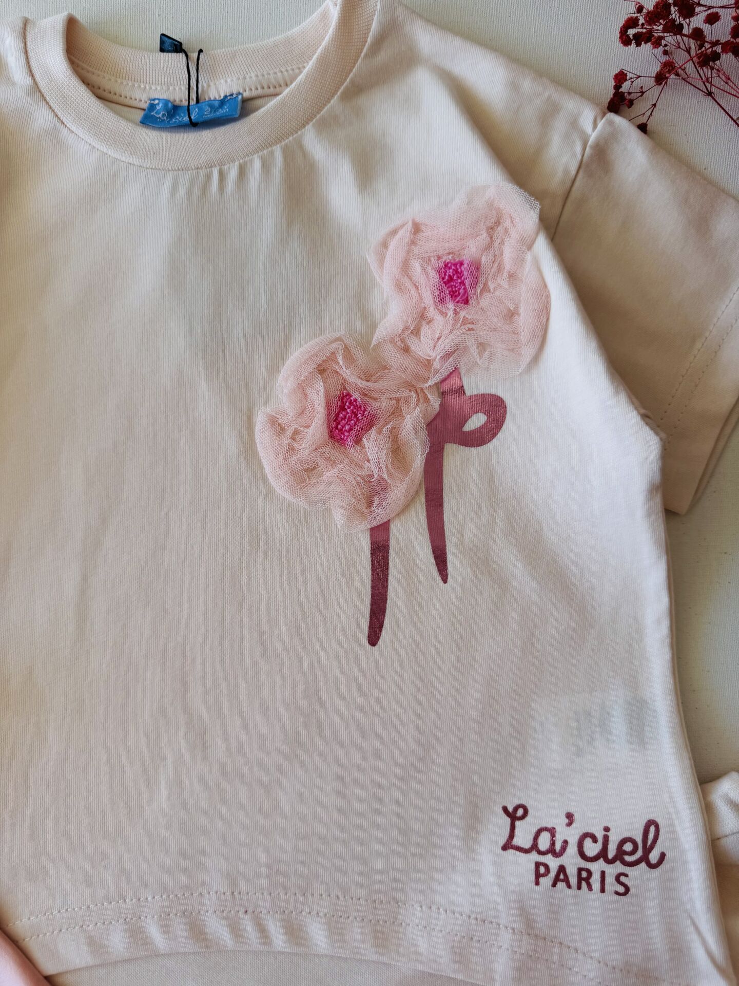 Tül Gül Aplikeli Sloganlı Gülce 2’li Takım - Pudra