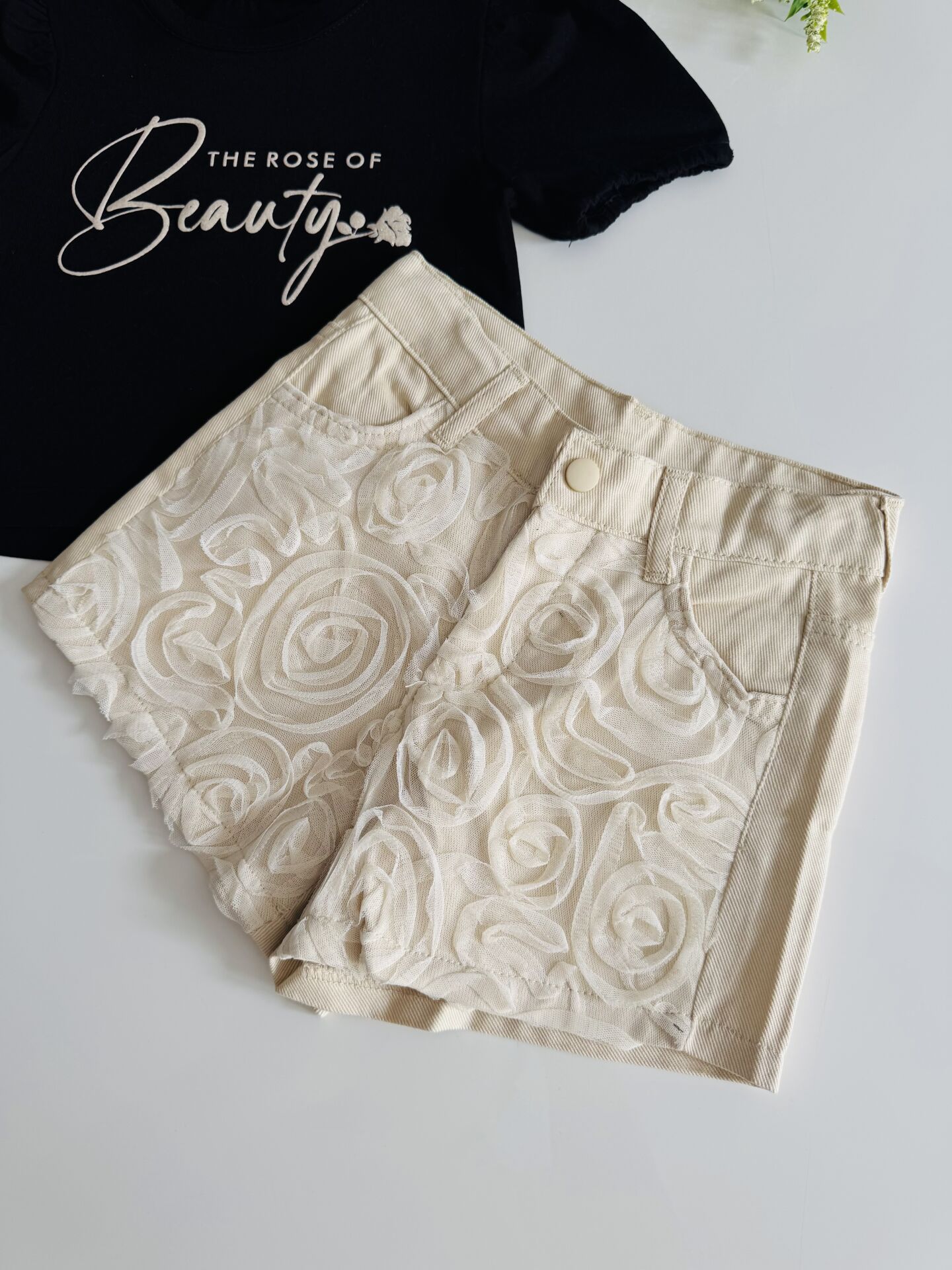 Ürün Bilgisi : İnanılmaz satılan çok sevilen Gülce takımın şort formu .. Tamamen gül aplikeli gabardin kumaş şort ve pamuklu penye kumaş takım