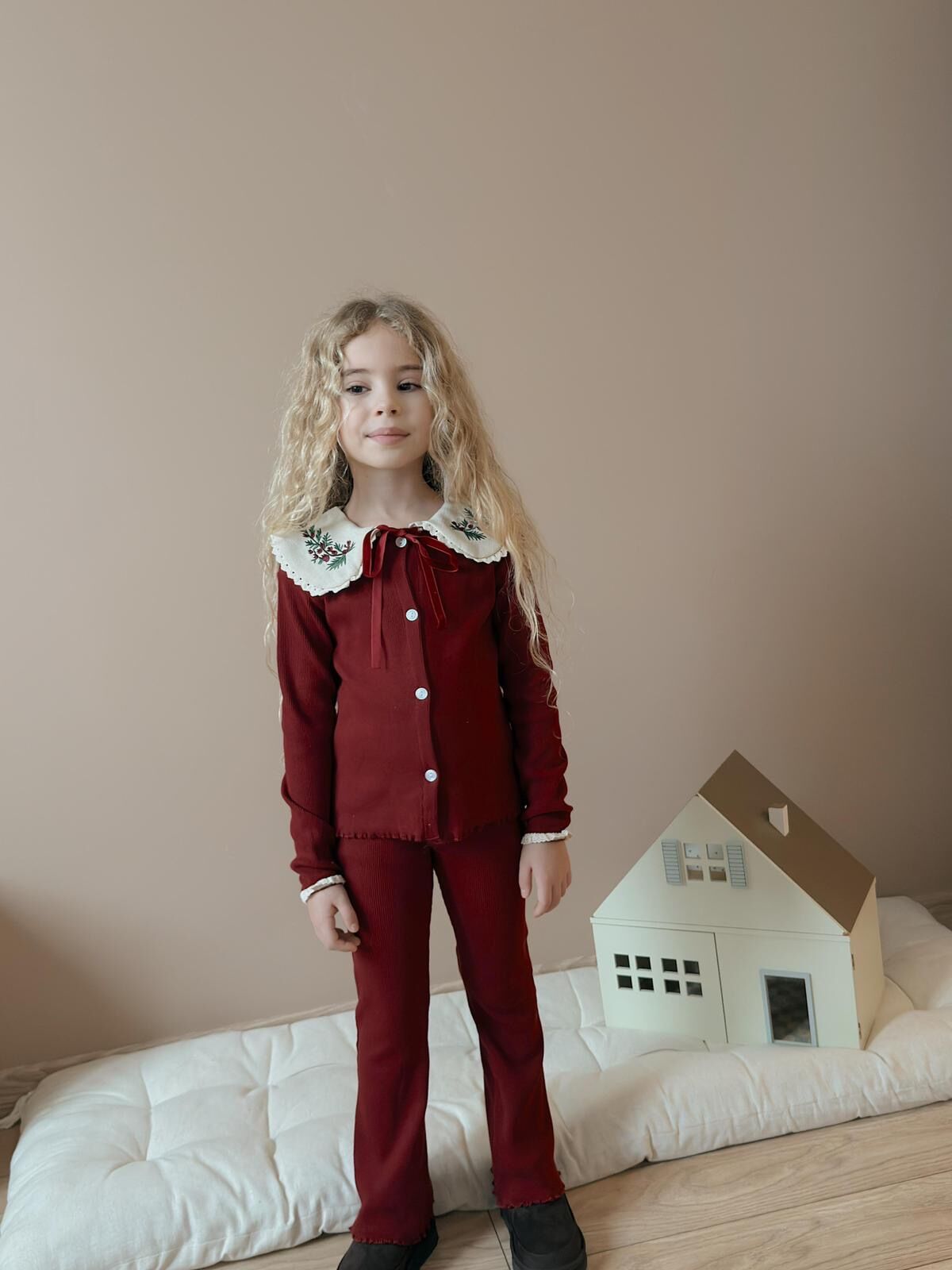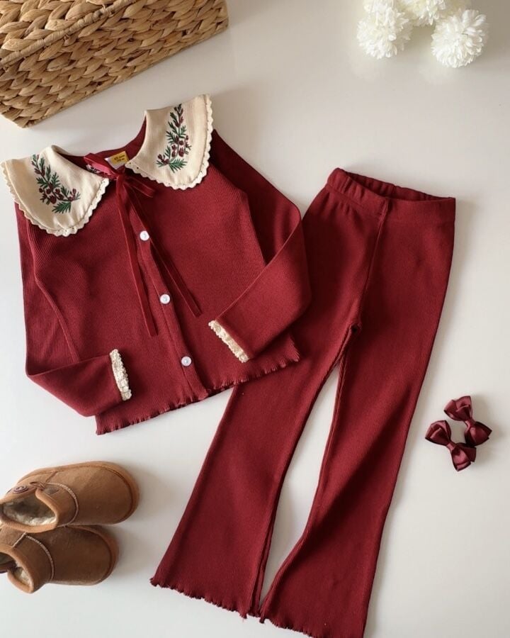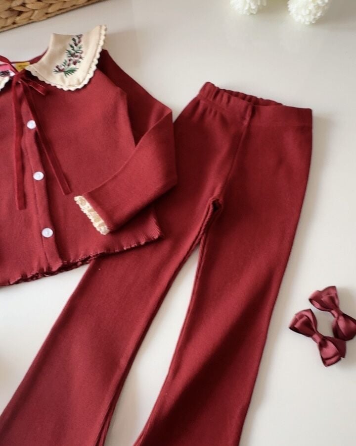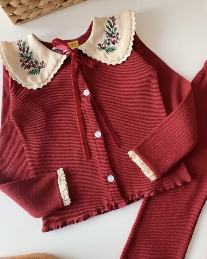 Yaka Nakışlı Ribana Taytlı Takım - Bordo