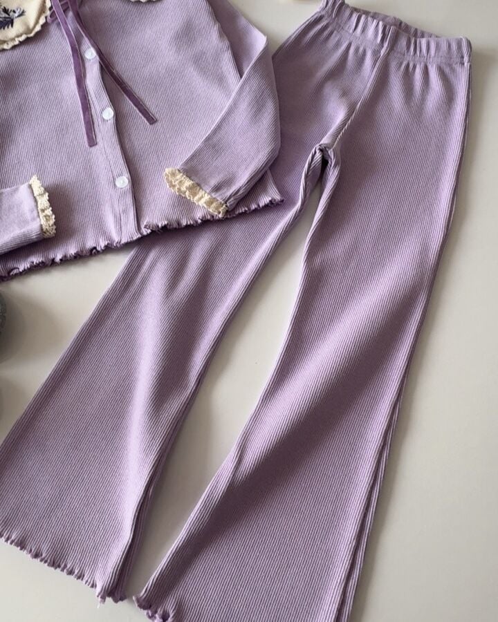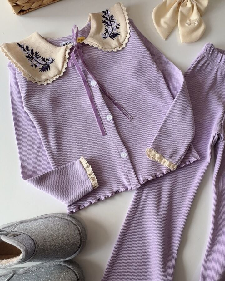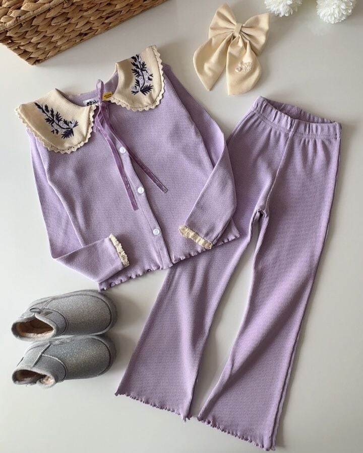 Yaka Nakışlı Ribana Taytlı Takım - Lila