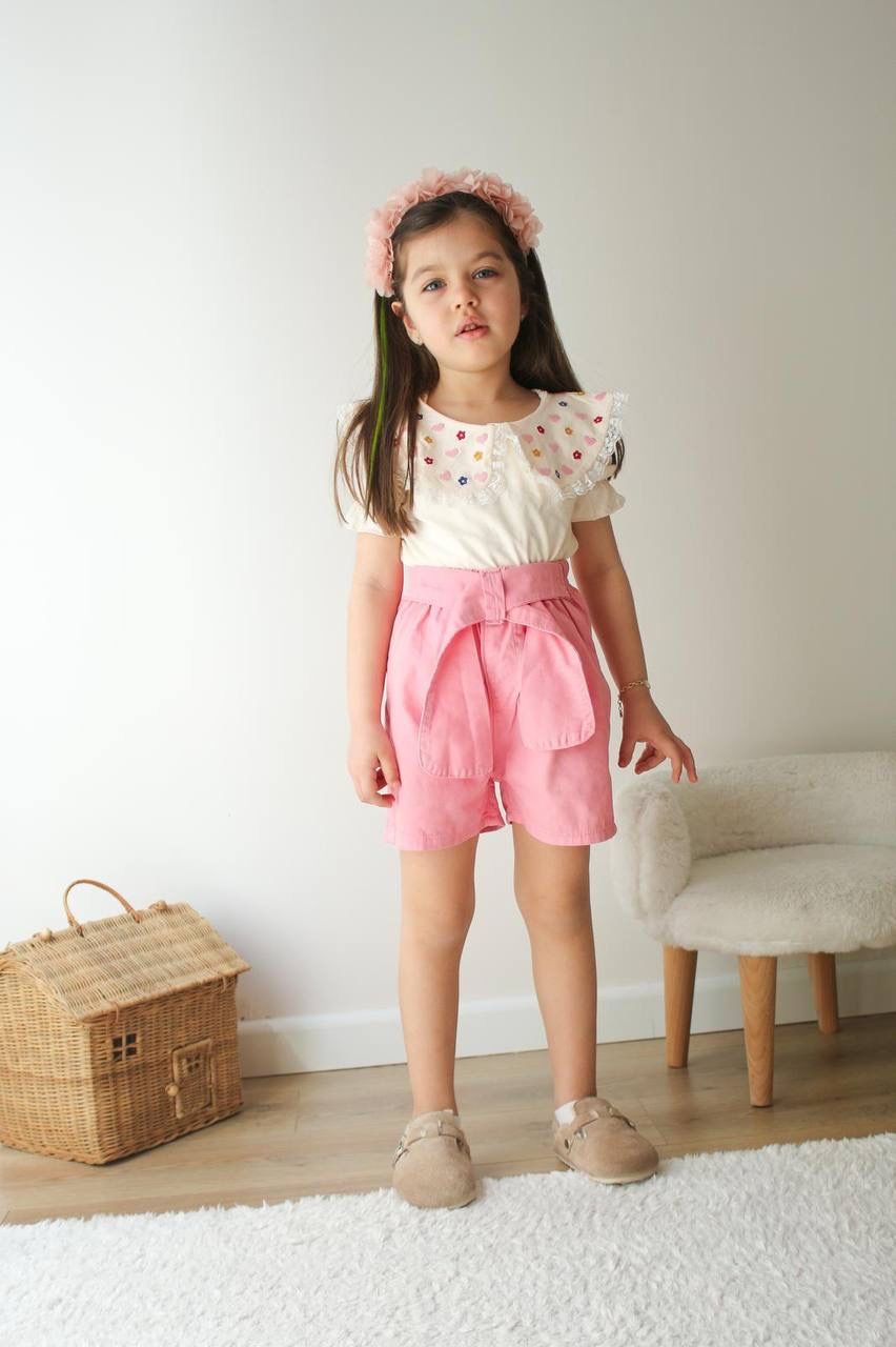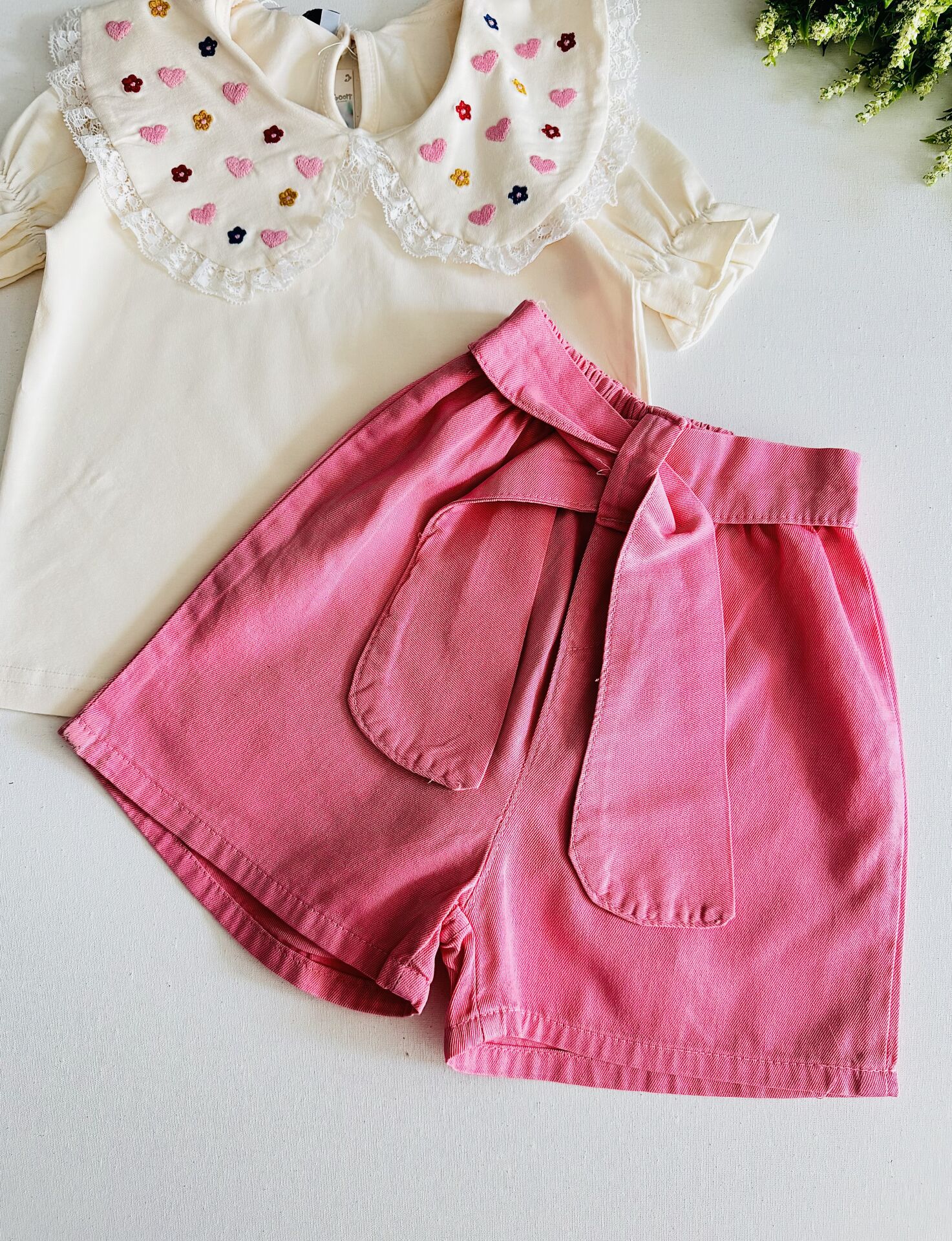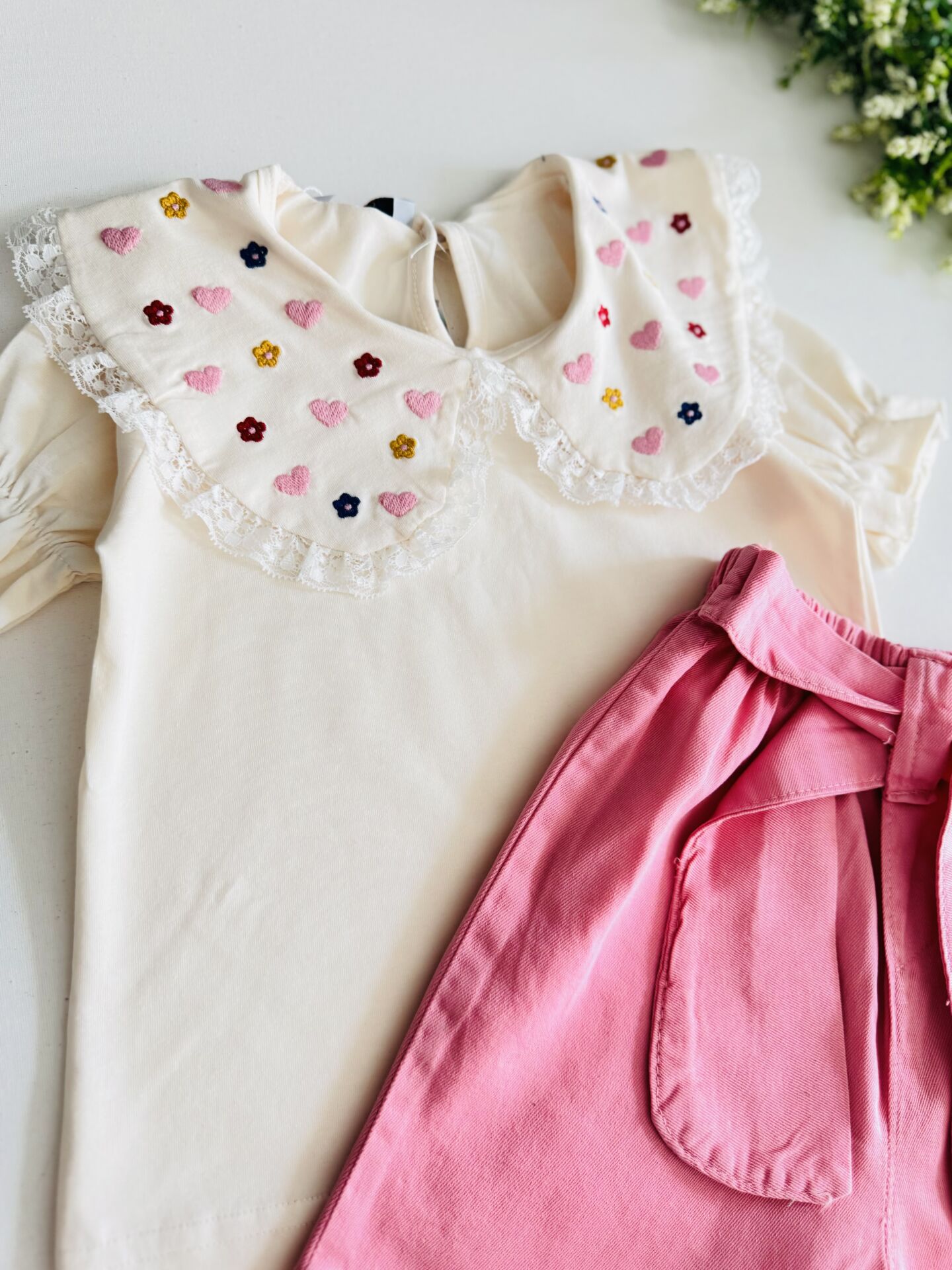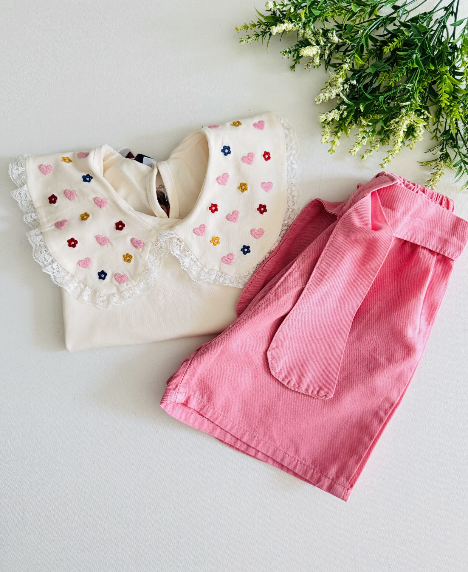 Yaka Nakışlı Şortlu Zeynep Takım - Beyaz Pembe