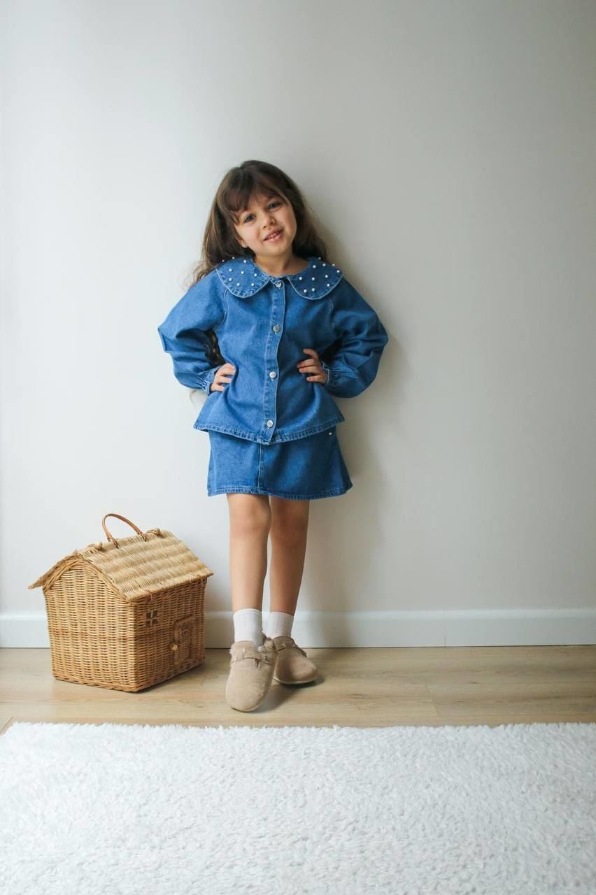 Yakası Eteği İnci Detaylı Denim Takım - Mavi
