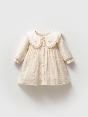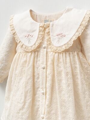 Yakası Nakış ve Fistolu Bebek Elbise - Krem