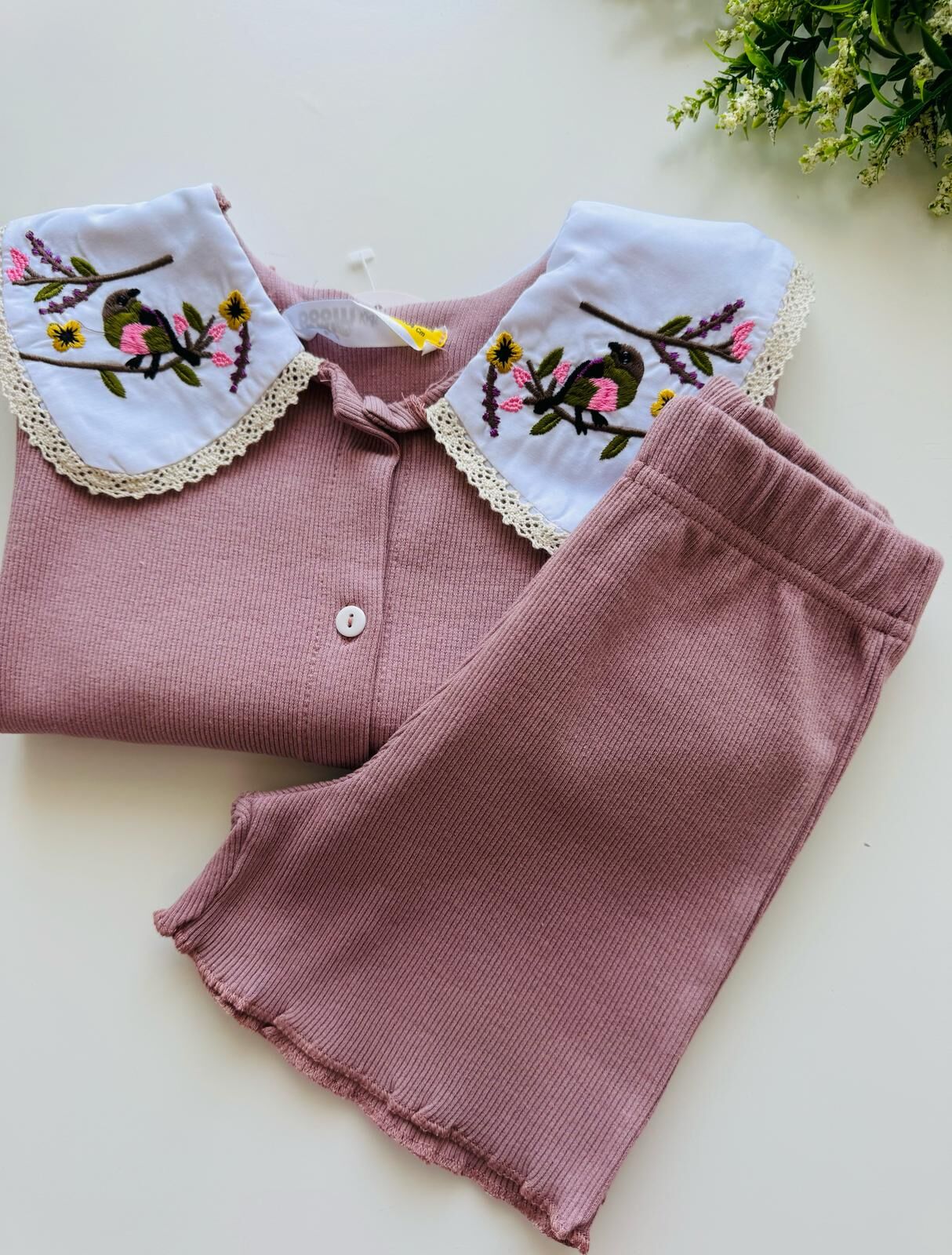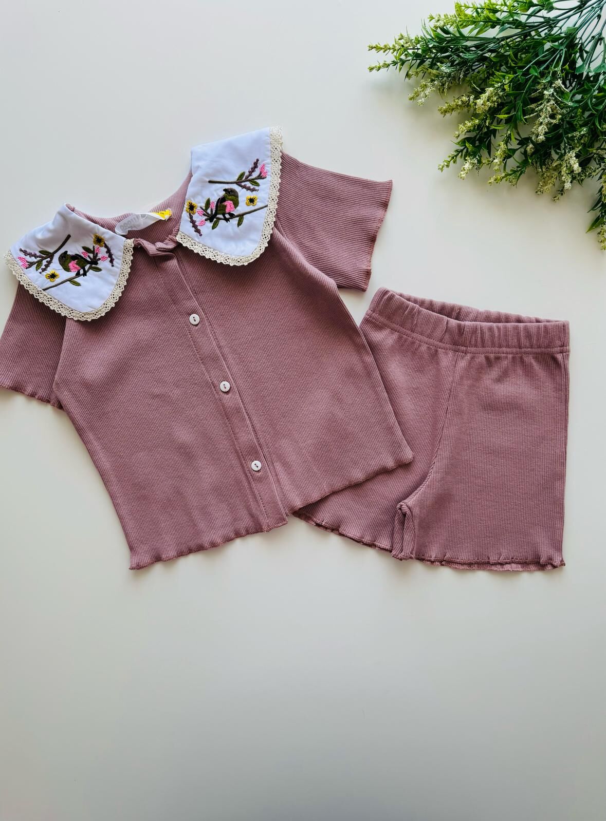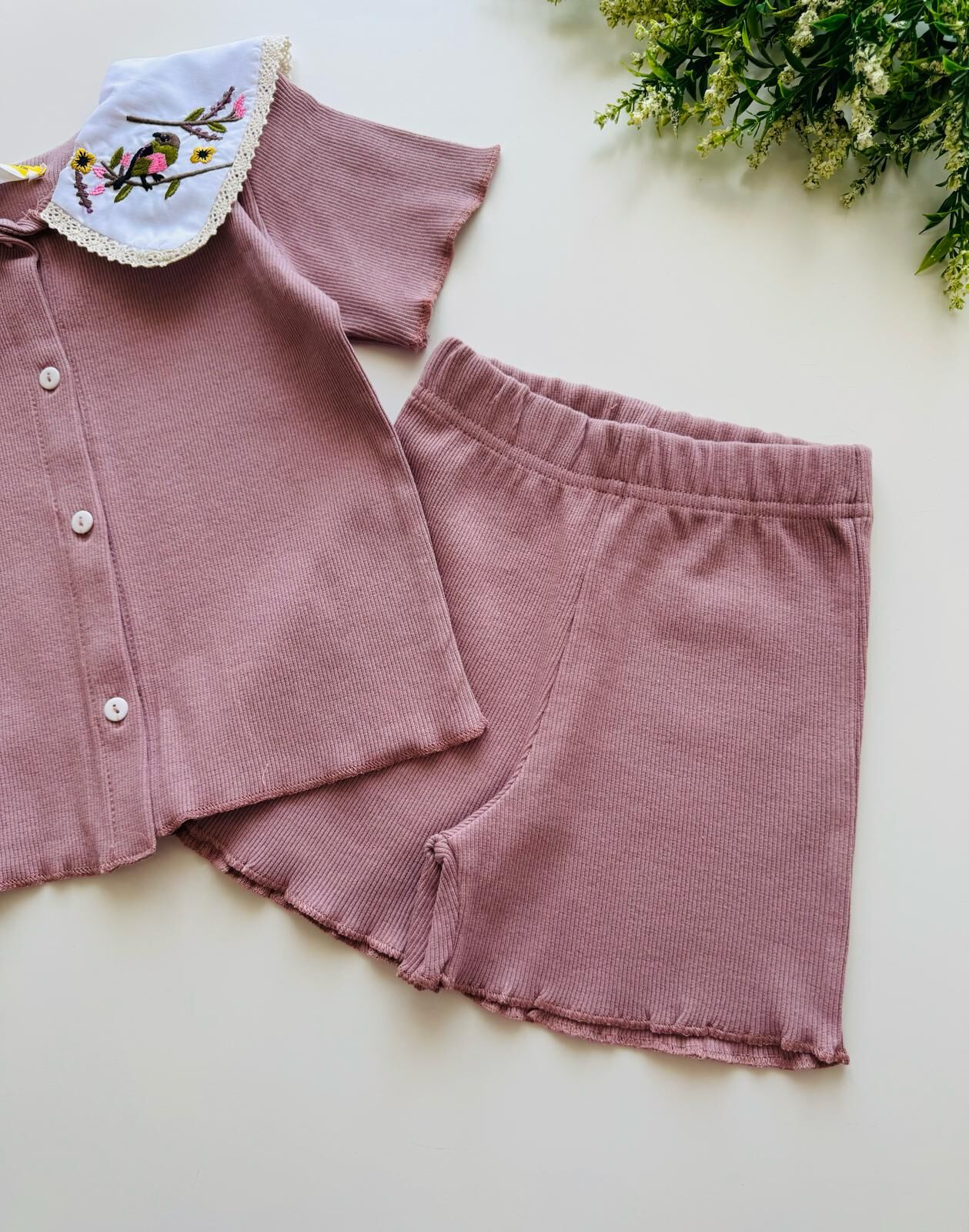 Ürün Bilgisi : Kaşkorse kumaş önü düğmeli yakası nakışlı şortlu takım