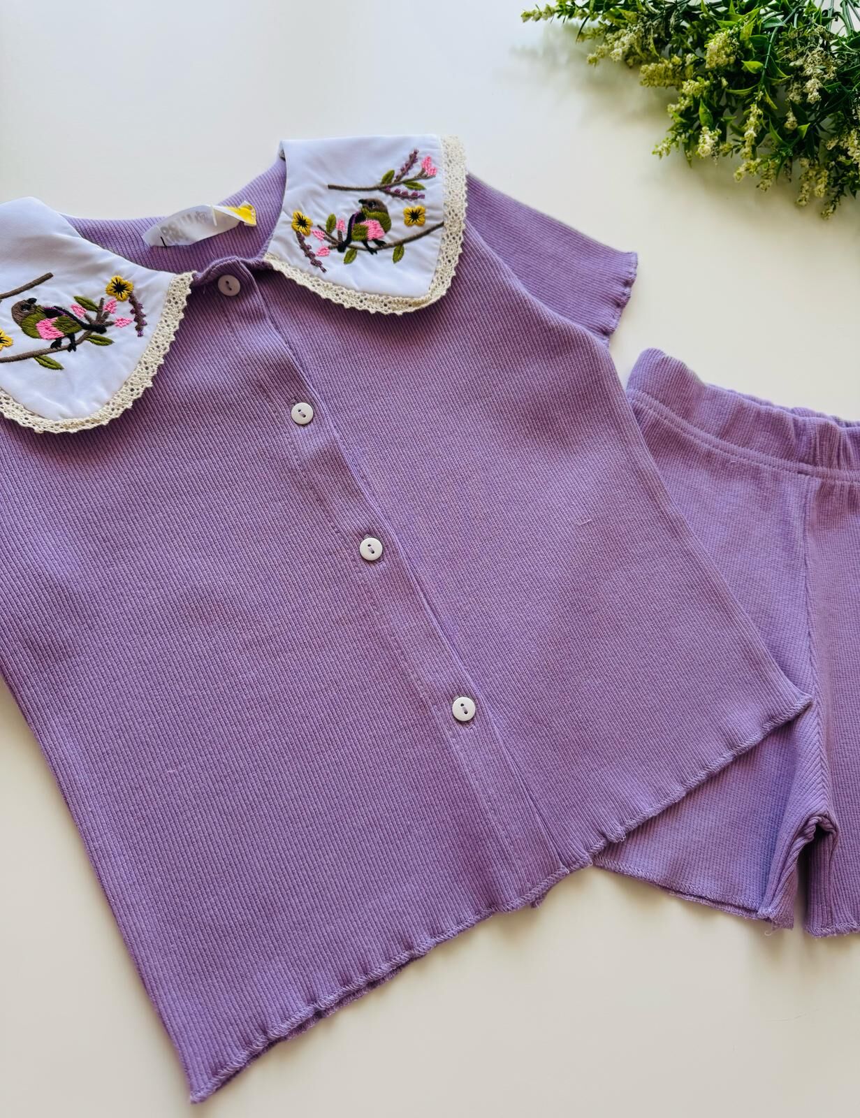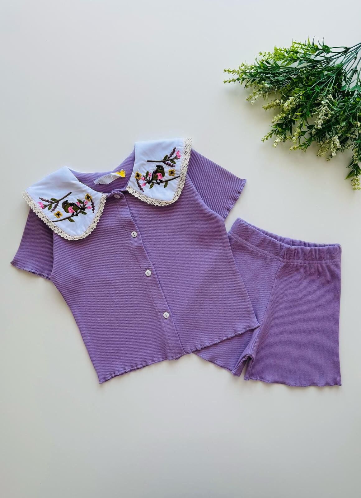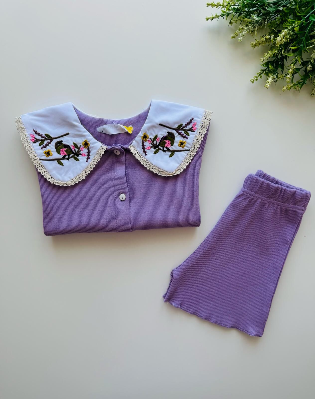 Ürün Bilgisi : Kaşkorse kumaş önü düğmeli yakası nakışlı şortlu takım