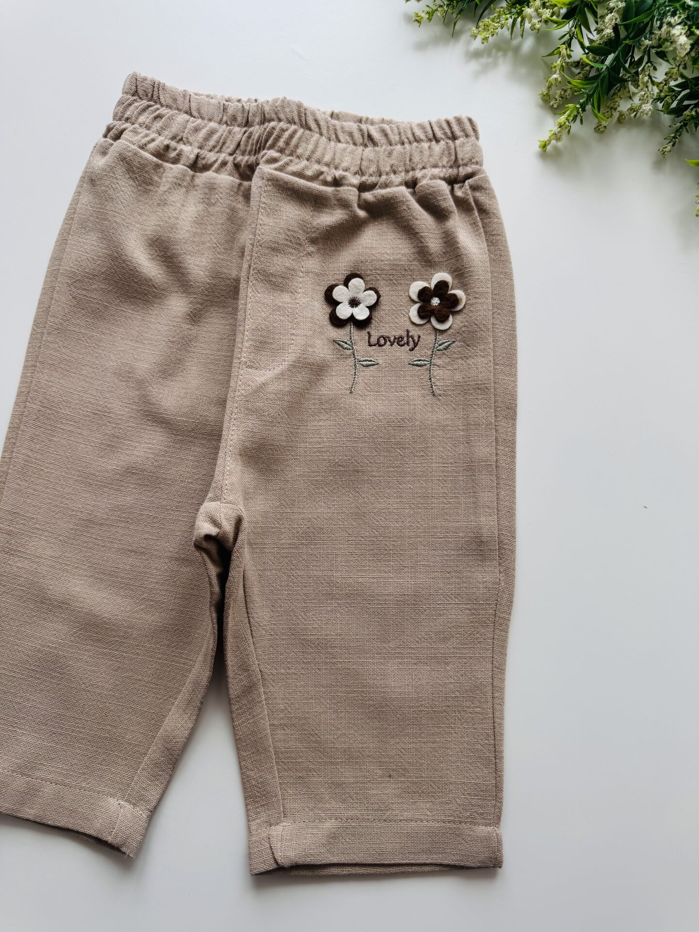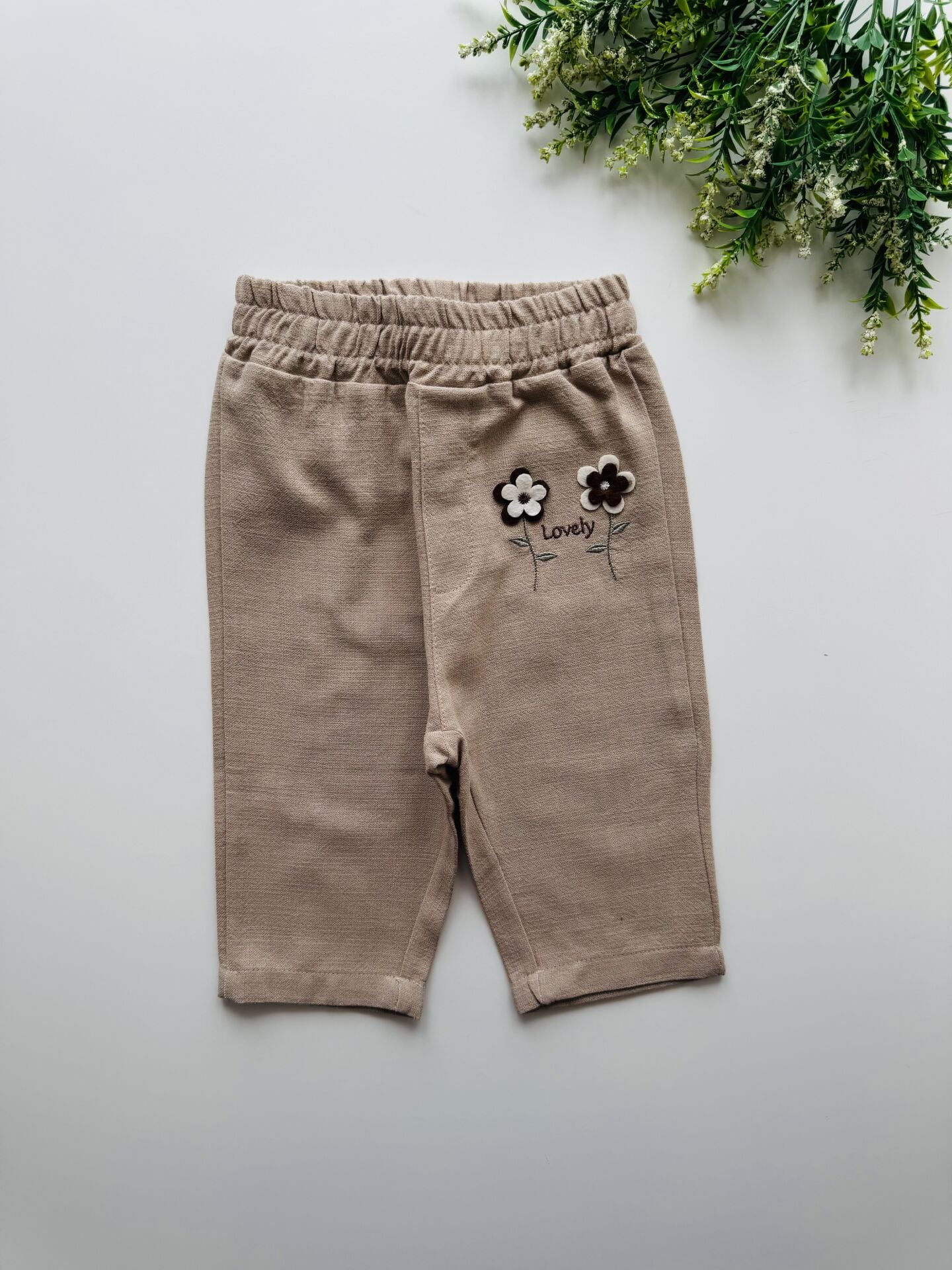 Ürün Bilgisi :Yumuşacık organik kumaştan çiçek aplikeli pantolon.
